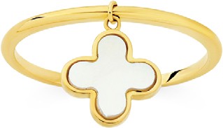 European Made 9ct Gold Mother of Pearl Clover Charm Stacker Ring. Available in Sizes O & Q. Approximate Dimensions - Clover=9x9mm.