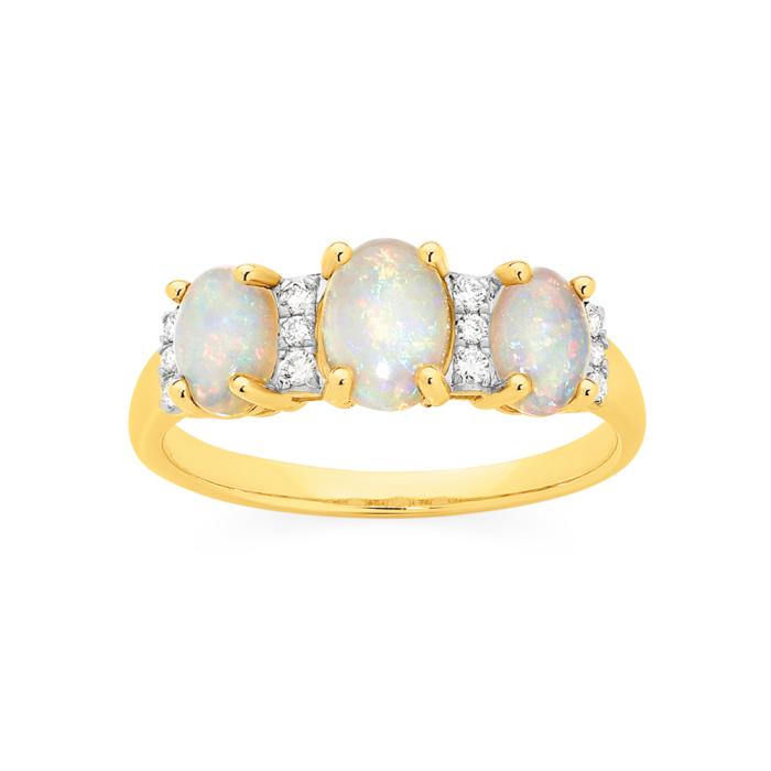 9ct Gold White Opal & Diamond Oval Trilogy Ring Total Diamond Weight: .10ct. Opal Stone Sizes = 7x5mm , 6x4mm.