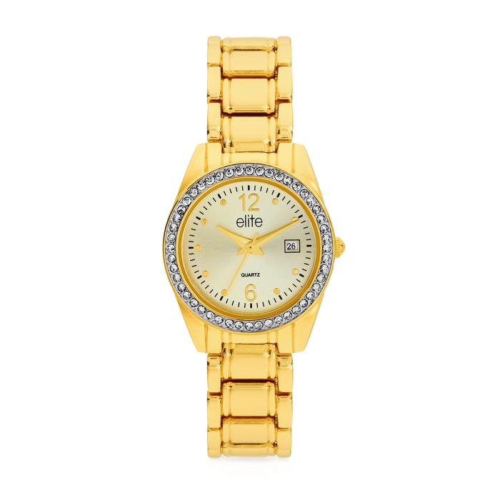 Introducing the Elite Royal- a stunning timepiece crafted for the woman who owns her style with confidence. Drenched in radiant gold-tone stainless steel and accented with a shimmering bezel of crystal stones, Royal adds instant glamour to any outfitday or night.