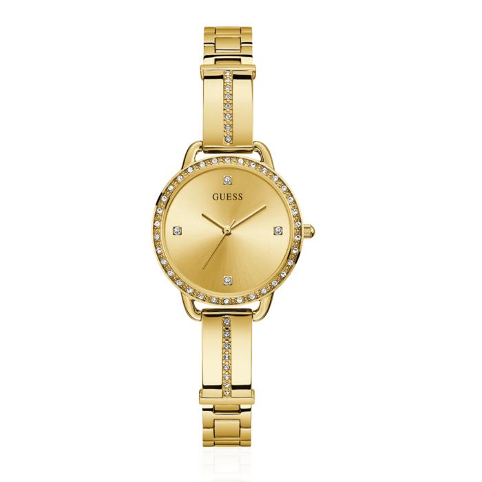 Show your stylish side with the petite Guess gold tone watch featuring bracelet style strap and crystal case.