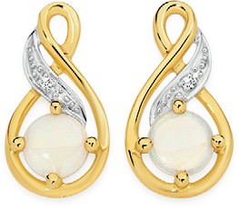 9ct Gold White Opal and Diamond Round Double Swirl Earrings. Approximate Dimensions 7mm Width x 14mm Height