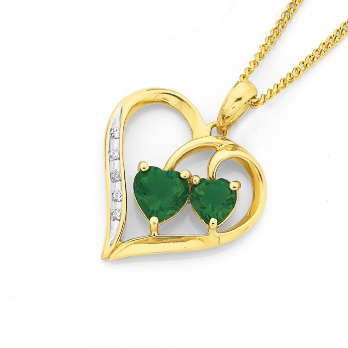 9ct Gold Created Emerald & Diamond Heart Pendant