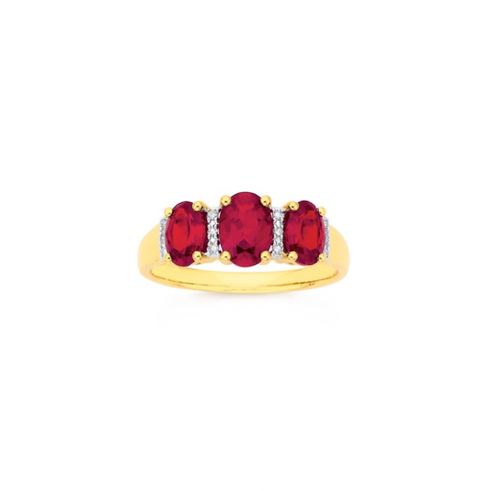 9ct Gold Created Ruby & Diamond Oval Cut Trilogy Dress Ring 7351374