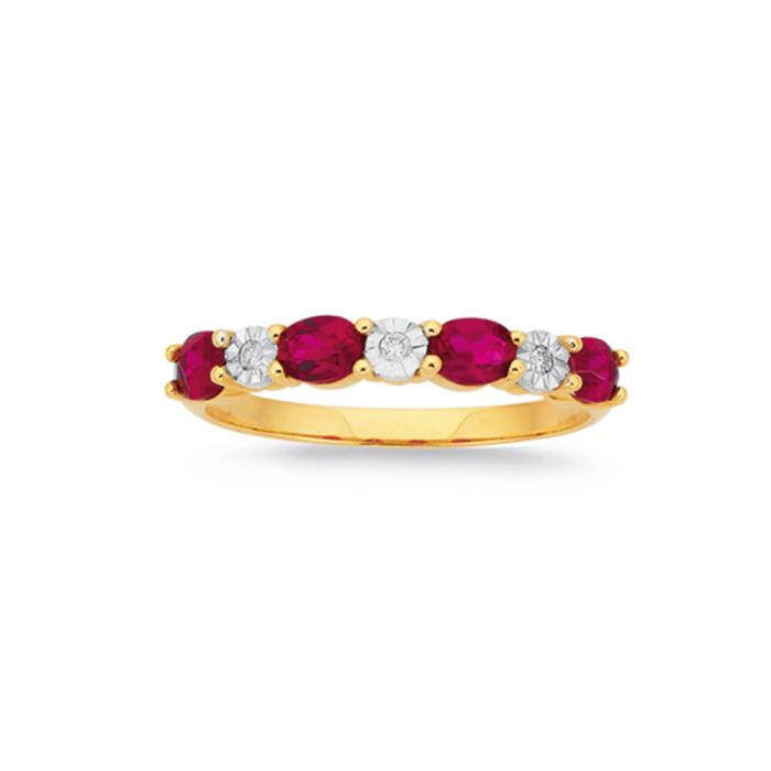 9ct Gold Created Ruby & Miracle Diamond Set Oval Cut Alternating Ring