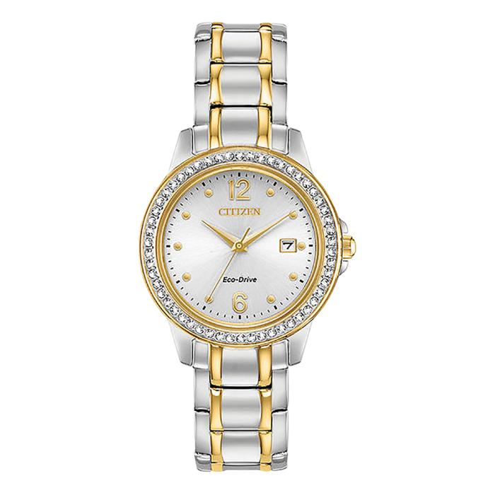 As part of Citizen Ladies Dress Collection, fashionable, precise and powered by light, creates an appeal unlike any other, decorated with crystals. Featured in two-tone stainless steel case and bracelet with a silver dial. Featuring our Eco-Drive technology powered by light, any light. Never needs a battery. Caliber number J710.