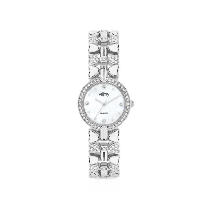 Elevate your elegance with the Millicent, a timeless piece of artistry and sophistication. This exquisite women's watch features a radiant silver-plated bracelet, delicately adorned with bow motifs and sparkling crystals that catch the light with every movement. The mother-of-pearl dial, framed by a halo of shimmering stones, adds a touch of classic grace, while minimalist hands and indices ensure effortless readability. Designed for the woman who embraces beauty in the details, the Millicent blends refined design with reliable quartz movement, offering both style and precision. Whether worn for an evening out or as a statement of daily sophistication, this watch is more than an accessoryit's an expression of elegance.