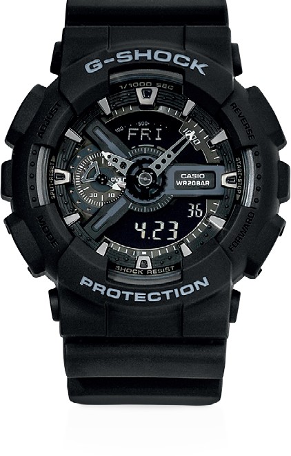 From G-SHOCK in its pursuit of toughness, this model from the GA-110 series features a big powerful face. Black is used as the main G-SHOCK-like color to express more strength. Equipped with a millisecond stopwatch, a speedometer, and JIS class-1 magnetic resistance. Small three-dimensional cog-shaped parts are assembled on the dial, which fuses analog and digital displays and features shiny silver indices that make the design stand out more sharply. A practical and cool model based on the ever-evolving G-SHOCK.