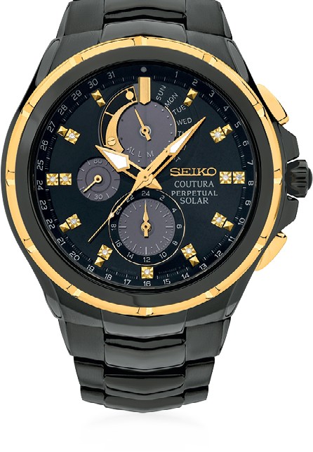 Seiko Coutura Men's Black and Gold Tone, Solar Powered, Chronograph, 11 Diamonds set Dial, Perpetual Calendar, Sapphire Glass, 100m Water Resistant Watch