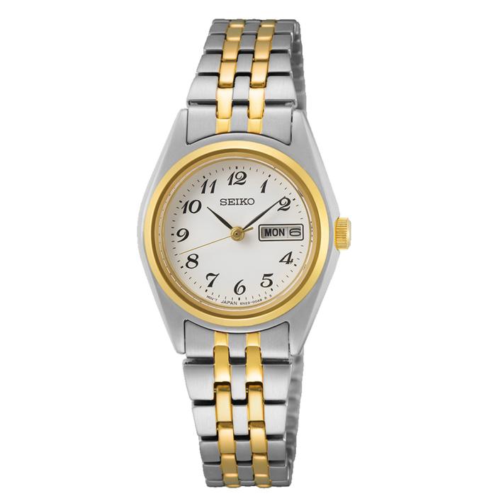 Seiko ladies, two-tone, arabic dial, day/date & 100m water resistant watch From the Essentials Collection. Offering classic dress/sport designs, the Essentials Collection provides the ideal solution for everyday wear. Crafted of stainless steel in gold-tone finish, this perfectly balanced watch features a white dial with Arabic numerals and day/date calendar for a superb blend of clarity and style. 10 bar, 100M Water Resistant