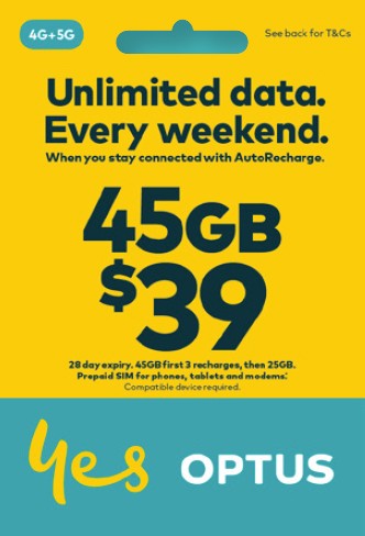Unlimited Data Weekends: from 12.01am Sat to 11.59pm Sun (local time) when you activate/recharge with AutoRecharge on $39 Optus Flex Plus (excl. expired or manual recharges). Not accessible on modems.
