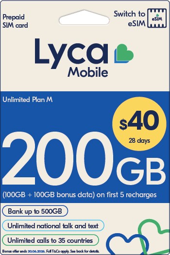 Lyca $40: 200GB/28days (100GB + 100GB bonus data) on activation and next 4 auto-renewals for new customers are valid until 30/06/2026. Ongoing 100GB/28 days on auto-renewal. Otherwise, 80GB/28 days 5G coverage in selected areas with compatible devices. Speed caps apply.