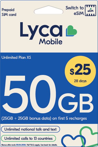 Lyca $25: 50GB/28days (25GB + 25GB bonus data) on activation and next 4 auto-renewals for new customers are valid until 30/06/2026. Ongoing 25GB/28 days.