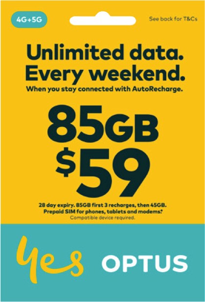 Unlimited Data Weekends: from 12.01am Sat to 11.59pm Sun (local time) when you activate/recharge with AutoRecharge on $59 Optus Flex Plus (excl. expired or manual recharges). Not accessible on modems.
