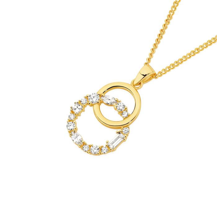 9ct Gold Cubic Zirconia/Polish Round Brilliant & Baguette Cut Double Circle Pendant. Height (including bale) = 25mm