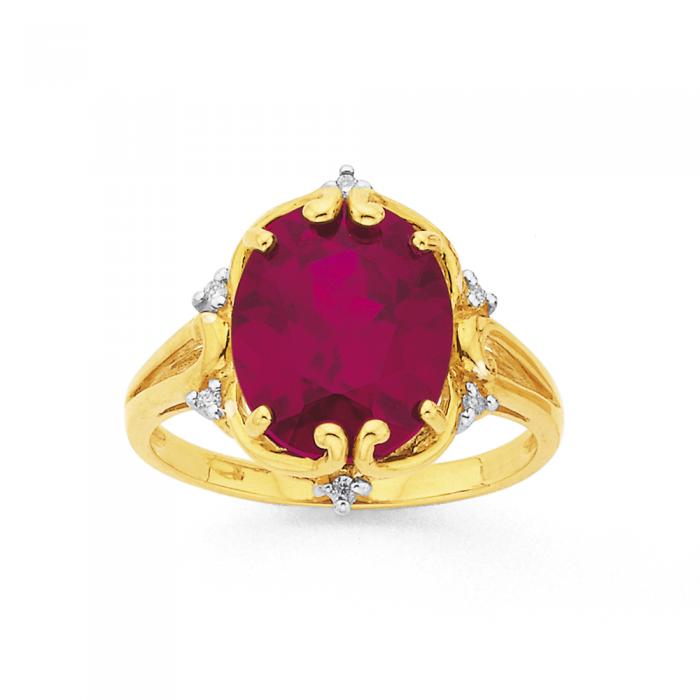 9ct Gold Created Ruby & Diamond Oval Cut Filigree Ring