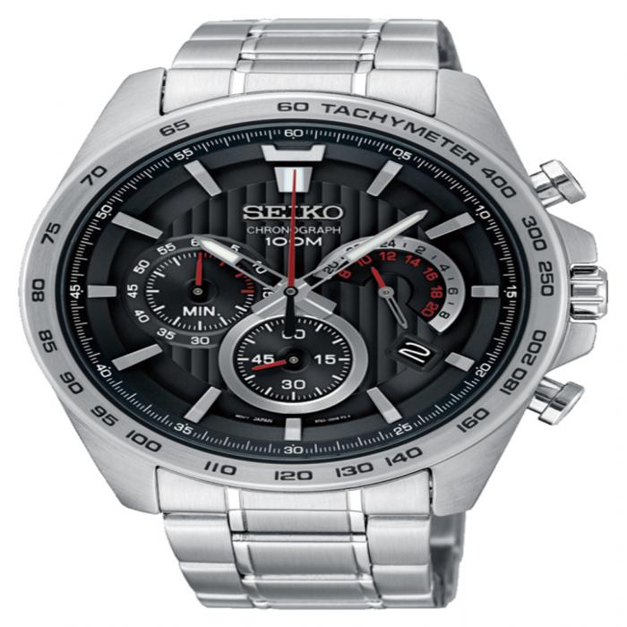 Seiko men's chronograph, silver tone tone, black dial, bracelet band & 100m water resistant watch
