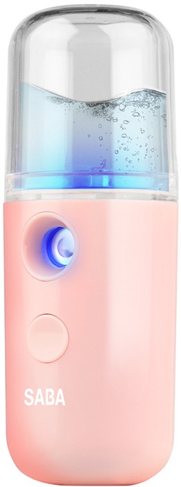 Dispenses ultra-fine mist at the touch of a button. Compact and portable design with 26mL refillable water tank. Includes USB charging cable.