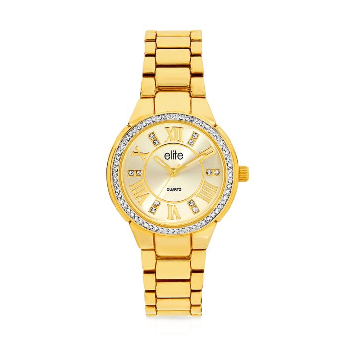 Radiance in Every Moment. Make a lasting impression with the Solaria Luxe, a timepiece that captures the essence of golden glamour. Crafted with a striking gold-tone finish, this watch features a captivating sunray dial that glows with refined brilliance under any light. The dial is elegantly adorned with Roman numeral hour markers and crystal accents, combining timeless design with a touch of sparkle. Encircled by a shimmering crystal-set bezel and finished with a sleek, polished bracelet, the Solaria Luxe is perfect for those who appreciate classic sophistication with a modern edge.