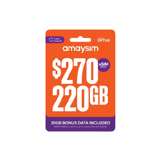*Terms and Fair Go policy apply. New services with 4G/5G compatible devices only. For use in Aus. Limit of 3 per customer. Promo price valid for first renewal till 2/12/25. Activate by 3/3/26 to get bonus data for first renewal. Bonus data not available with any other offer and not exchangeable or redeemable for cash. Ongoing is $270/200GB/365 days. Auto renews every 365 days. Inclusions when you choose $270 UNLIMITED plan. See amaysim.com.au/270 for details. Download speed caps apply. 5G available in selected areas (excl NT) with a compatible device. eSIM requires an eSIM compatible device. See amaysim.com.au/about/coverage. See amaysim.com.au/terms. While stocks last. Products may not be available in all stores. Please see woolworths.com.au for "device" stock availability at a store near you. SIM Starter Pack availability is unavailable online and needs to be checked in-store.