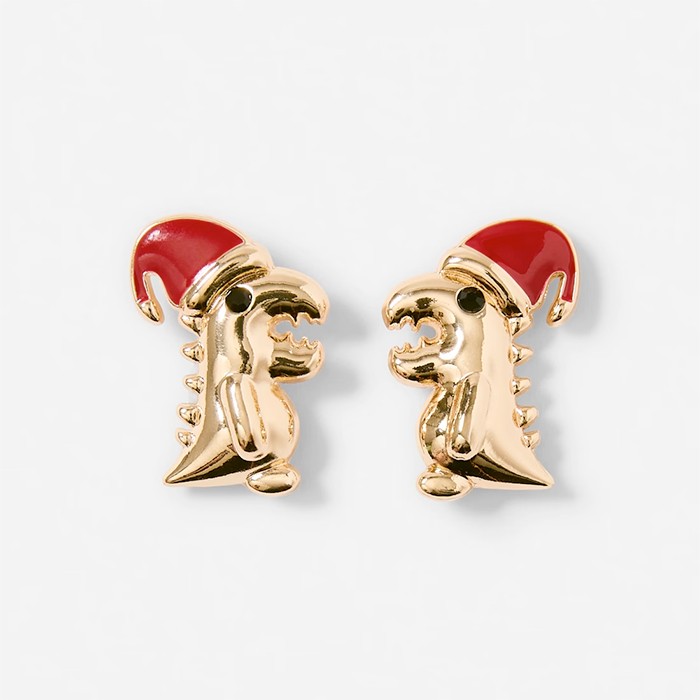 Christmas Dinosaur Earrings - Gold Tone and Red