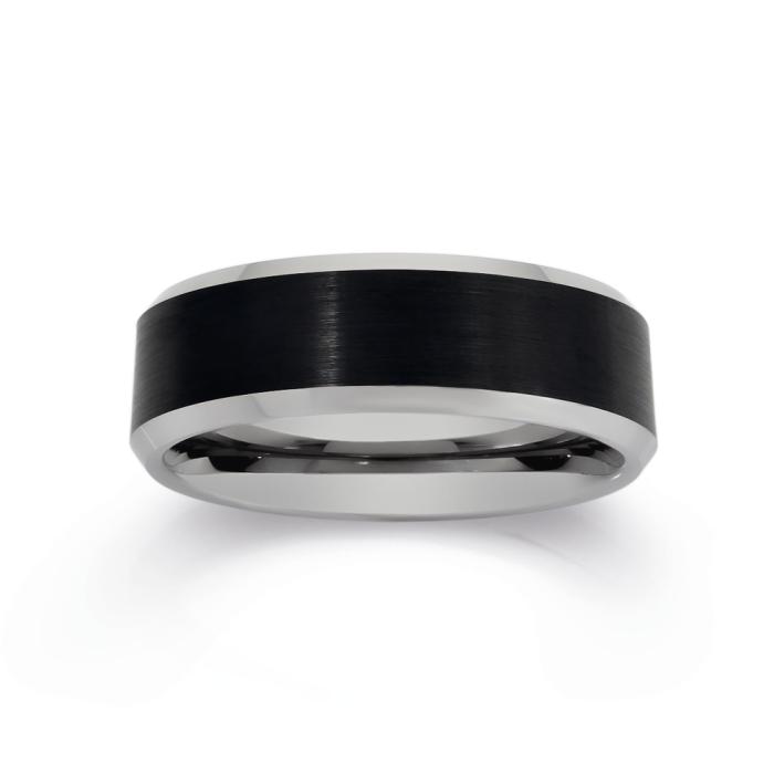 Tungsten Carbide Matt Black Silver Bevelled Edge Gents Ring