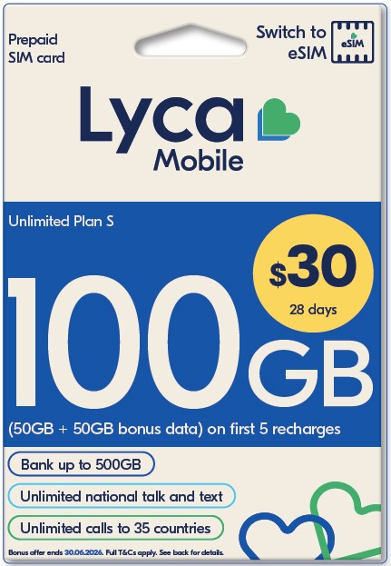 Lyca $30: 100GB/28 days (50GB + 50GB bonus data) on activation and next 4 auto-renewals for new customers are valid until 30/06/2026. Ongoing 50GB/28 days.