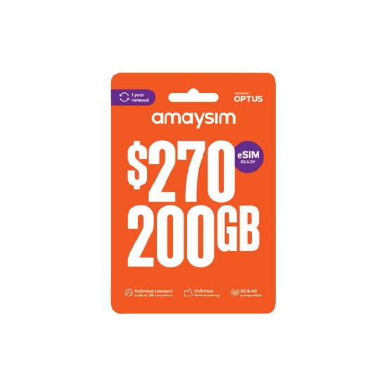 *Terms and Fair Go policy apply. New services with 4G/5G compatible devices only. For use in Aus. Limit of 3 per customer. See amaysim.com.au/international/calls for full list of countries with unlimited international talk and text. Promo price valid for first renewal till 5/5/26 (activation counts as first renewal), ongoing is $270/200GB/365 days. Auto-renews every 365 days. Inclusions when you choose $270 UNLIMITED plan. See amaysim.com.au/270 for details. Download speed caps apply. 5G available in selected areas (excl NT) with a compatible device. See amaysim.com.au/about/coverage. eSIM requires an eSIM compatible device. See amaysim.com.au/terms for full terms and policies. While stocks last.